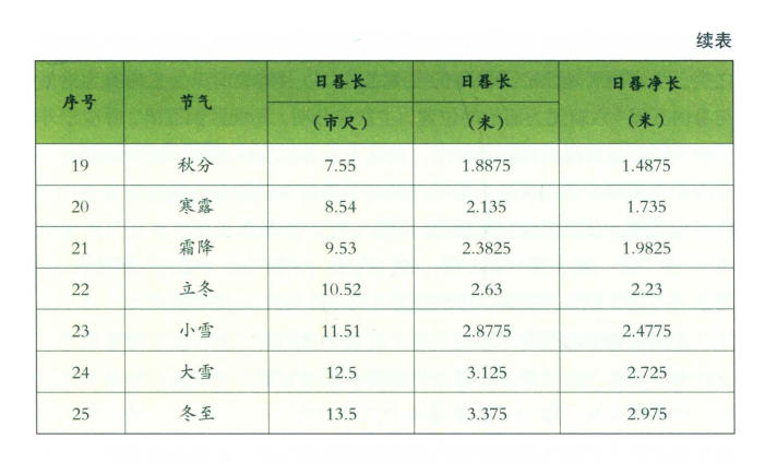 《周髀算经》介绍了勾股定理及其在测量上的应用,以及怎样引用到天文计算之中。“髀”,股也。立八尺之表为股,表影为勾。用八尺长的标竿竖起来测量太阳中午照射的影子,立春那天影子的长度为一丈五寸二分。《周髀算经》记载了八节二十四气的计算方法,因为算法是为质象之炁服务的,因此与西方纯以物相而论的历法也就存在着一定的差异,在“以西解中”的过程中,不抛弃东方文化“以质论物”的法则,才不会丢失根本。以下是现代人根据古人记录而计算出来的二十四节气日晷长度。